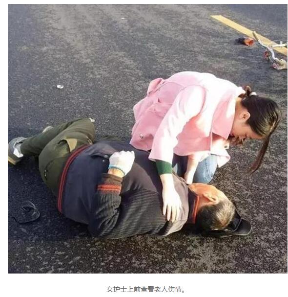当时恰巧一名女护士经过,只见她一边跑向伤者,一边喊“我是护士!我是护士!”并在初冬寒风中,脱下外套盖在受伤老汉身上。