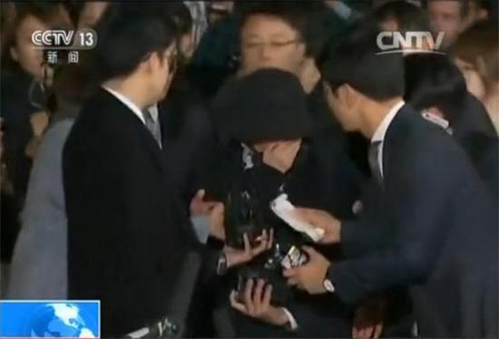 崔顺实前往首尔中央地方检察厅接受检方传唤,遭媒体“围攻”。
