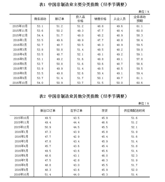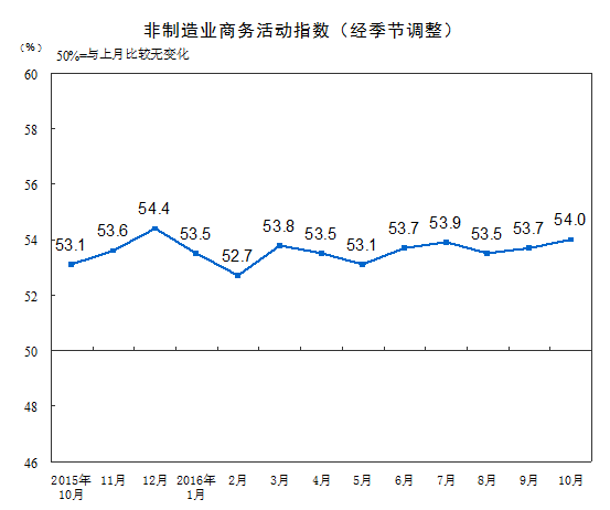 2016年10月份,中国非制造业商务活动指数为54.0%,比上月上升0.3个百分点,为今年以来的高点,表明非制造业保持扩张态势,增速继续加快。