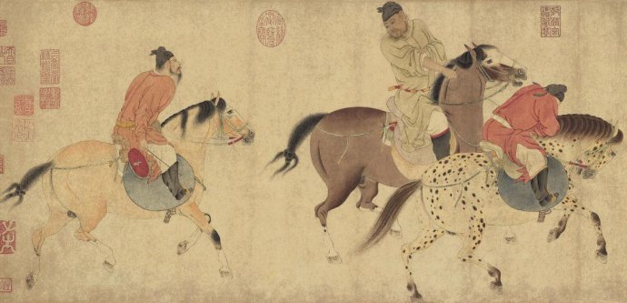 《五王醉归图卷》用的是宋代纸本,高35.5厘米,长212.5厘米,曾是清宫旧藏。该画刻画了唐玄宗五兄弟的故事,画中五王,指临淄王李隆基(即后来的唐玄宗)、宋王李成器、申王李成礼、岐王李范、薛王李业。唐玄宗年少时与四位兄弟感情和睦,经常相从宴饮,斗鸡击球,外出打猎。这张画描绘了兄弟五人一起骑马游玩的场景。