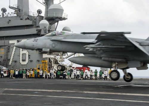 日方人员1日在美军参演航母上观看舰载机着舰(美国海军网站)
