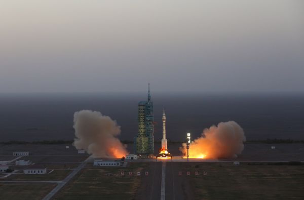10月17日7时30分,搭载着神舟十一号载人飞船的长征二号F遥十一运载火箭在酒泉卫星发射中心点火升空。 新华社记者李刚摄