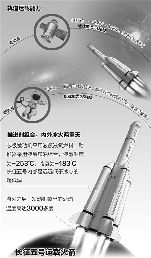 “胖五”也称冰箭,因为它肚子里装满深低温液氢液氧燃料,其中液氢温度达零下253摄氏度、液氧达零下183摄氏度。