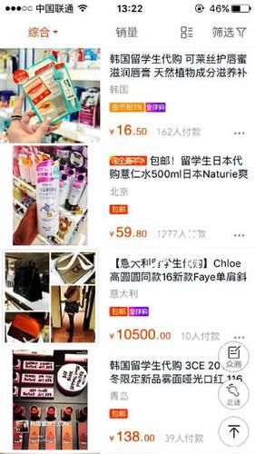 在淘宝网上搜索“留学生代购”,网页会迅速显示出上百条留学生代购信息。代购的地区包括韩国、日本、意大利、澳大利亚、美国等多个国家;代购的商品种类有化妆品、服饰、奢侈品、奶粉等。