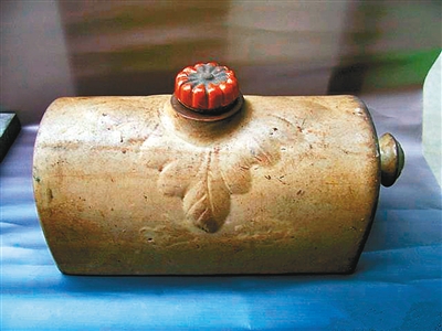 我的这件民国陶制汤婆子,便是奶奶带过来的陪嫁品,已经有近百年的历史了。它有别于那种常见的南瓜形,整体为一个半圆柱形,长28厘米,宽15厘米,高12厘米,一端平滑,一端有个小把手,便于用手拿放。其顶部有个艳丽的桔黄色旋盖,被设计成一个特别的磨盘造型。打开这个旋盖,就可以注入热水。汤婆子上端还有大片的荷叶纹饰,荷叶下方游动着锦鲤,因为长期使用的缘故,表面的釉色已经磨去,露出了白陶土的底色,看起来更显古朴。(周小丽)