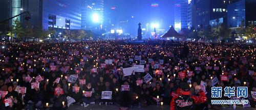 11月5日,在韩国首尔,韩国民众参加要求总统朴槿惠下台的烛光集会。当日,韩国民众在首尔市中心举行集会活动,要求总统朴槿惠下台。据韩媒报道,警方估计实际参加当晚集会的民众约有4.5万人。根据韩国民调机构“真实计量器”3日公布的民调结果,受“亲信干政”事件影响,55.3%的受访者认为总统朴槿惠应下台或被弹劾。新华社记者姚琪琳摄