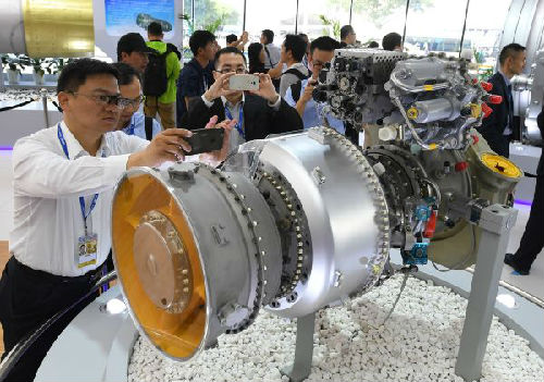 2016年11月2日,观众在中国航空发动机集团公司展台前近距离参观“玉龙”发动机。新华社发