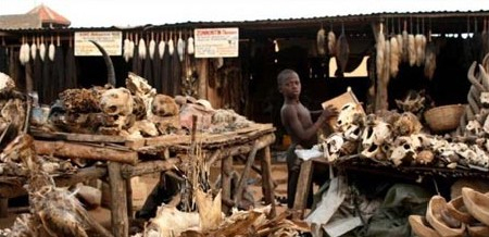 位于西非国家多哥Akodessewa地区的神物祭祀品市场被公认为是世界上最大的巫术祭品市场,来自非洲各地的巫师都到这里寻找他们作法时需要的祭品符咒。这里弥漫着动物的腐蚀性气味,各种动物的毛皮尸骨琳琅满目,它们都来自非洲各处的原始丛林。