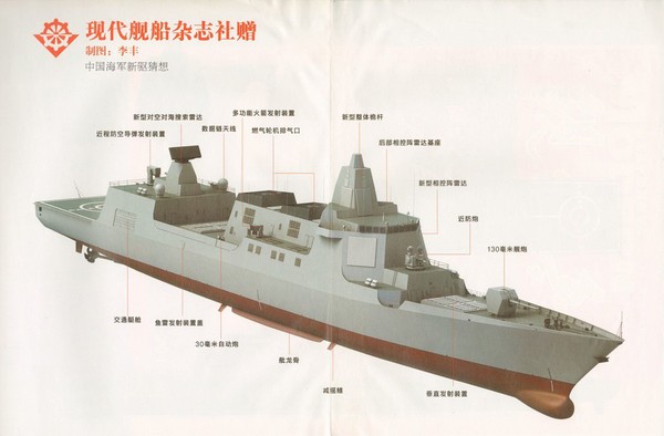 【环球网军事报道】中国海军的下一代驱逐舰被称为是055型,有分析称该舰排水量将达到上万吨,采用新型整体桅杆是其典型特征,在各方面的能力上都要比现有的052C、052D型驱逐舰有大幅提升。以下就是汇总于网络的中国新型驱逐舰猜想图。(图片来源:现代舰船杂志)