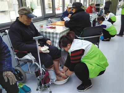 昨日,石景山乐龄“养老驿站”工作人员为老人洗脚。新京报记者 李玉坤 摄