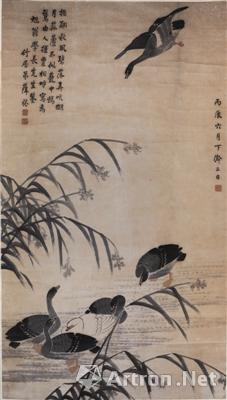 这幅《芦雁图》轴,纵120厘米,横92厘米,纸本,设色水墨画。上写河滩之上,水低沙平,芦花飘雪。芦苇沼泽上的五只芦雁,或曲颈理羽,或俯首觅食,或缩首酣睡,或俯仰唼咂,或引颈远望。此时,滩头上空有一只高声啼叫的芦雁,已双足伸出,即将落地。顿时,芦苇沼泽上的芦雁纷纷秋风振翮,弄吭明月,使寂静的河滩雁声嘹亮,划破夜空,突现生机。这正是“画雁分别见雁鸣,缣湘飒飒荻芦声,笔头何限秋风冷,尽是关山离别情?!贝送妓渲恍绰懔唬廾墒?,各尽形态,无一雷同,而又无一不真,充分说明了作者对芦雁的习性了如指掌,观察细微。故所写芦雁,得心应手,神采奕奕,达到了出神入化的效果。