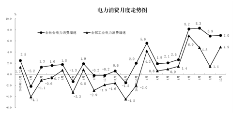 10月份,全社会用电量同比增长7.0%,增速比上月扩大0.1个百分点。1-10月份,全社会用电量同比增长4.8%,比上年同期加快4.1个百分点。
