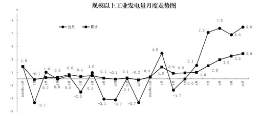 10月份,规模以上工业发电量同比增长8.0%,增速比上月加快1.2个百分点。1-10月份,规模以上工业发电量同比增长3.9%,比上年同期加快4.0个百分点。