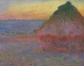 在莫奈晚年沉迷于睡莲的创作时,他曾说:“我一天到头和这些画布打交道?;艘徽庞忠徽?,有些颜色在前几天画的时候消失了,调不出来了,可是画着画着又突然出来了。当我以为我捕捉到一种颜色时,我尽全力把它落实到画布上,可是它来去无踪,刚出现,就消失了,呈现出另一种我等待了好几天,想画在另外一张画上的奇妙颜色。所以我一天到头停不下来!”作为印象派的代表人物,克劳德?莫奈对光影变化的追逐是终生的,从生到死如同疯狂逐日的夸父。当我们欣赏睡莲时,我们看到的是仿佛无边无际的炫目色彩和光影世界,并非一朵一朵的清秀睡莲。对这种风格的探索在干草堆系列中是非常明显的。一个孤零零的干草堆,一个在普通人眼中枯燥单调索然无味的干草堆,在莫奈眼中却千变万化恍如大千世界,画面在潜意识中向四周无限延伸蔓延,爬满整个精神空间。无关钱财名望,这是莫奈对自我内在精神的探索,是他对于自然界近乎执念的追求。
