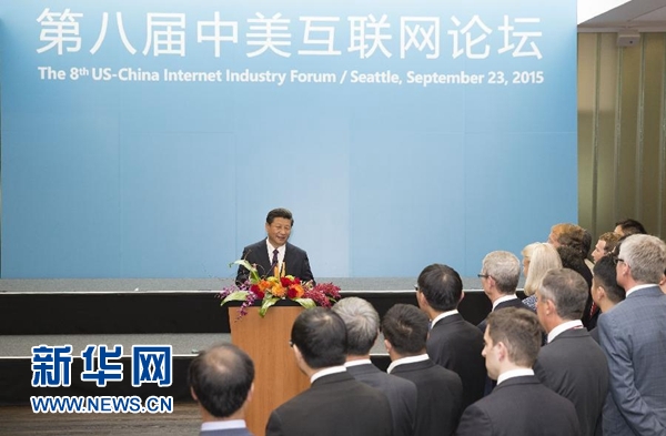 2015年9月23日,国家主席习近平在西雅图微软公司总部会见出席中美互联网论坛双方主要代表并发表讲话。 新华社记者 黄敬文 摄