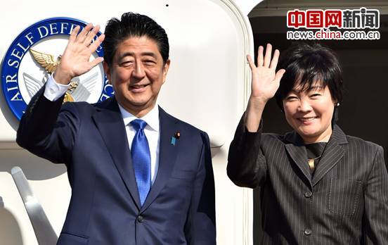 当地时间2016年11月17日,日本东京,日本首相安倍晋三与夫人安倍昭惠登机,准备前往美国访问。(CFP)