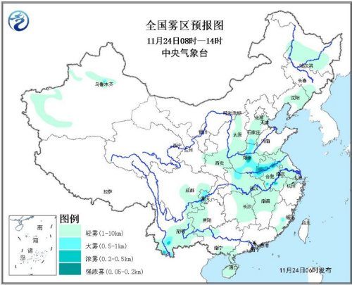 中新网11月24日电 据中央气象台网站消息,未来三天,华北中南部、黄淮北部、东北地区中部等地空气污染扩散条件较差,将有轻到中度霾,华北中部局地有重度霾; 24日早晨至上午,河南中部和东南部、安徽北部等地的部分地区有大雾,局地有能见度不足500米的浓雾。为此,中央气象台11月24日06时继续发布大雾预报。