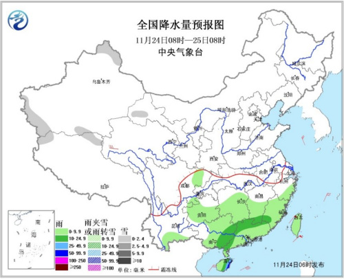 具体为:24日08时至25日08时,新疆北部和西南部、甘肃北部等地的部分地区有小雪或阵雪;云南南部、贵州中南部、江南中南部、华南等地有小到中雨,其中,海南岛东部等地的部分地区有大雨,局地有暴雨。东海大部、台湾海峡、南海北部和中部将有7~8级、阵风9~10级的东北风,其中,台湾海峡局部海域的风力可达9级、阵风10~11级。