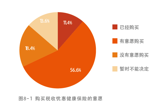 今年1月1日起,全国31个城市正式启动商业健康保险个人所得税政策试点。调查发现,已经购买税收优惠健康保险产品的职工比例为11.4%,没有购买但有意愿购买的职工比例高达56.6%。比较而言,没有意愿购买和暂时不能决定的职工比例仅为32%。根据该项保险已实施的效果来看,并不理想,可能一个重要的原因是政府和相关金融机构宣传和推广的力度还不够。