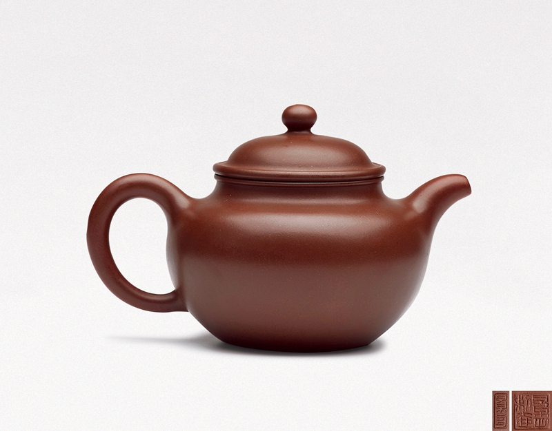 顾景舟《掇只》质感清雅,温和大气,此壶有着浑圆的壶身,半圆的壶盖,圆钮,线条流畅,比例得当,压盖略微浑厚,点线之间见出魅力,子母线口盖温和严密,骨肉亭匀,简练大方,制作颇见功力。弯流嘴胥出,在端头下压,柔美之姿明显,壶柄略微上抬之后优雅滑落而下,形成一条圆润饱满的弧线,朴雅大方。