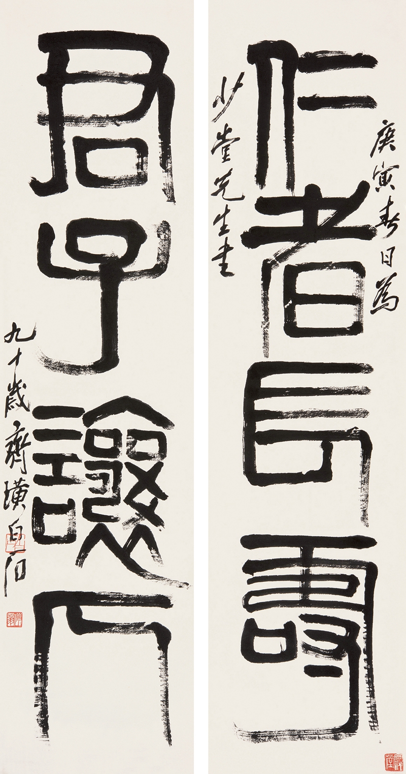 秋拍,宝聚斋中国书画专场将推出齐白石《篆书四言联》,此联写“仁者长寿,君子让人”,款题“九十岁齐璜白石”。其用笔在篆隶之间方圆兼备,强调劲折的粗细变化,尤其是线条中的“飞白”,能明显看出用笔的韵律和节奏。这种心手两忘、无法之法的化境,是经过他几十年的刻苦磨练和体会才达到的。更为难得的是,这件作品是北京市文物公司的旧藏,曾于2006年参加首都博物馆举办的“齐白石艺术大展”,并出版于《齐白石艺术大展集萃》一书中,可见这是齐白石晚年极其珍贵的代表作。