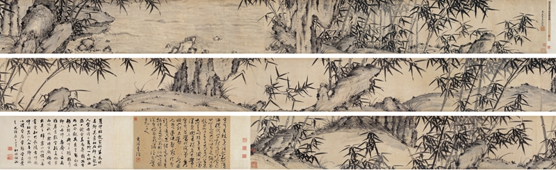 秋拍,翰海古代书画专场将推出夏昶《万竿新笋图》,为翁同和旧藏,手卷全长近8米,卷末有明代书法家张弼跋。此卷以墨笔画竹石,是夏昶的典型风格,夏昶画竹,强调气韵,主张“一气呵成”,竹叶落墨即是,不见复笔,山石以斧劈皴法大笔侧锋挥扫而成。夏昶笔下的墨竹已不仅仅是简单的文人式的寄兴抒怀,而是还竹于其自然的生长环境之中,在竹画中融入山水画的笔墨意境,表现出精深的功力和独树一帜的艺术风格。