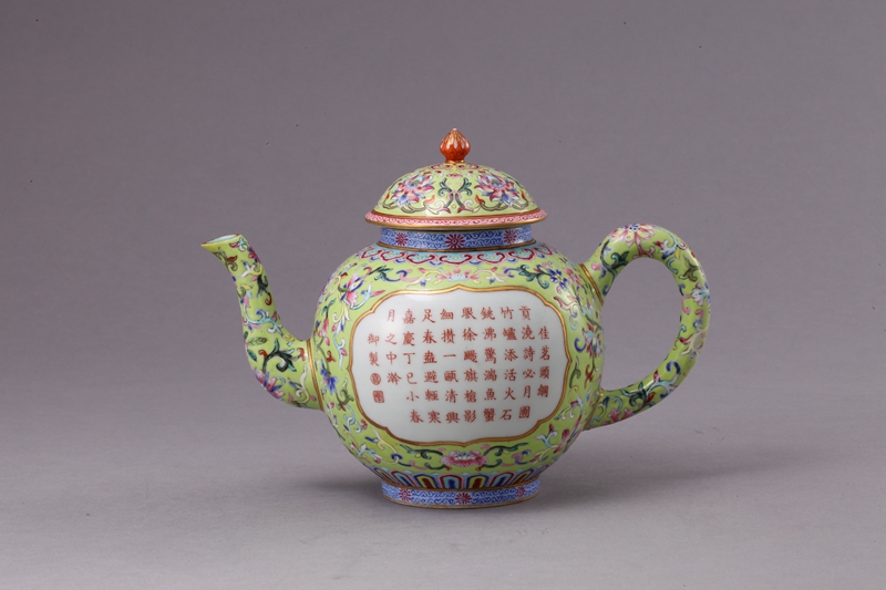 嘉庆时期,官窑瓷器的精细品仍具有乾隆时期的规范,其胎釉、粉彩和单色釉保持乾隆时期风貌,此时的瓷器茶具,有壶、碗、洗等,其中的绿地器通?;婧剖位蚩馐?。本场推出的“清嘉庆 绿地粉彩开光诗文花卉茶壶”器内及外底均施松石绿釉,外腹壁以绿彩为地,间绘缠枝莲纹,两侧海棠形开光,内以矾红书嘉庆御题诗,底书“大清嘉庆年制”篆书款。此类形制与乾隆茶壶造型相同,颇为精致华丽。