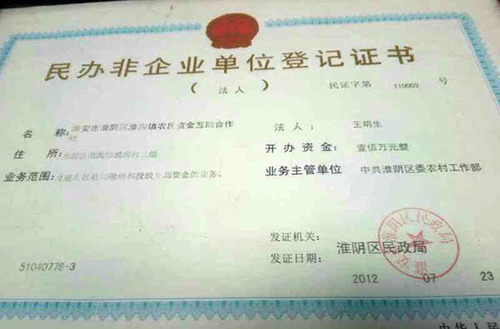 民政局为淮阴区农民资金互助合作社颁发的《民办非企业单位登记证书》(2012年版)