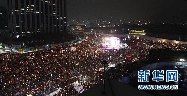 11月26日,在韩国首尔,集会人群挤满光化门广场。当日,韩国民众在首尔市中心举行大规模集会,要求朴槿惠总统对“亲信干政”事件负责并立即下台。新华社记者姚琪琳摄