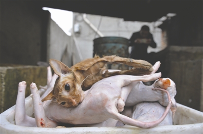 黄平富说,这些“新鲜的肉”并非兔肉,而是猫肉。成都商报记者看到,麻袋里的猫已全部去皮、去内脏。记者称需要大量的新鲜货源,询问黄平富一天能杀多少只猫,黄平富爽快地回答:“100多根(只)嘛,把头去掉,再剁成块,个头跟兔子差不多,没人能分出来?!?/p>