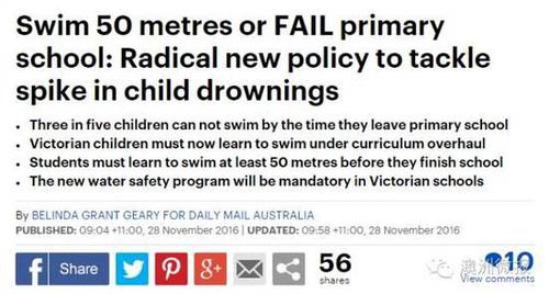 “去年,一共有43个孩子因为溺水而丢命?!闭庋氖莩隽?0年平均水平的5倍。所以澳洲政府必须做更多的事情,并且确保游泳以及水中安全求生技能成为澳洲小学生课程的必修部分。