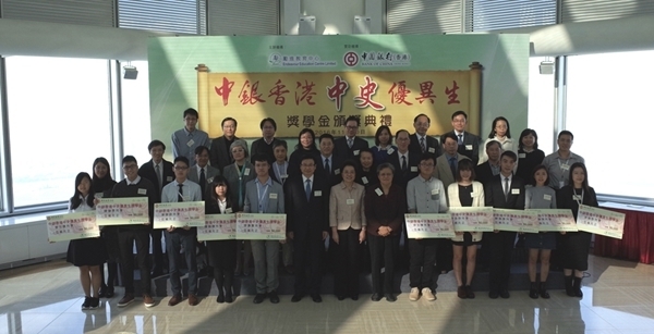 励进教育中心举行“中银香港中史优异生奖学金”颁奖礼,中联办副主任仇鸿(前右七)颁奖予得奖学生。
