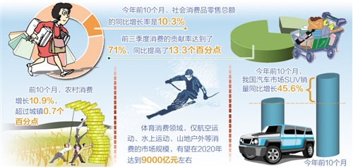今年前10个月,社会消费品零售总额的同比增长率是10.3%,达到两位数。消费对经济增长的带动作用也明显增强。前三季度消费的贡献率达到71%,同比提高13.3个百分点。