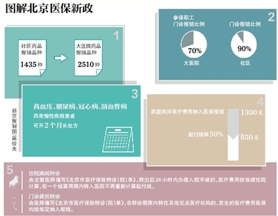 昨日,北京市人社局发布医保新政,北京所有大医院可报销的药品都能在社区医院走医保报销。同时,患高血压、糖尿病、冠心病、脑血管病等四类慢性病患者可开具2个月的长处方,并按医保报销。新政从今日起正式实施。