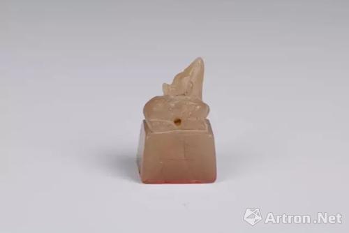 历史回眸:1972年,新昌县城南乡丁村小学兴建校舍时,发现一墓,并发掘一方锥形印面阴刻篆文“卢渊”两字印章。刀法古朴苍劲,笔力雄厚,印钮雕蹲鹿昂首仰天状,钮肚下有一横穿孔,既可供系绳线携带。此莹润米黄色冻石质印石,高3.4厘米、长2.2厘、宽1.9厘米。