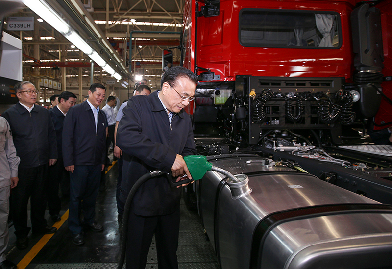 2016年5月23日,李克强到湖北十堰考察东风商用车重卡新工厂,在装配生产线旁应邀为新型重卡加油。