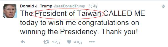特朗普在美东时间2日下午16时44分在推特(Twitter)上发文,他说:“‘台湾总统’今天打电话给我,祝贺我当选,谢谢你。”(The President of Taiwan CALLED ME today to wish me congratulations on winning the Presidency. Thank you!)
