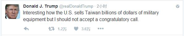 此后,台湾“联合新闻网”称,特朗普又发表了新的推文。他说:“真有趣,美国向台湾出售数十亿美元的军事装备,而我却不能接受一个祝贺的电话?!?Interesting how the U.S. sells Taiwan billions of dollars of military equipment but I should not accept a congratulatory call.)