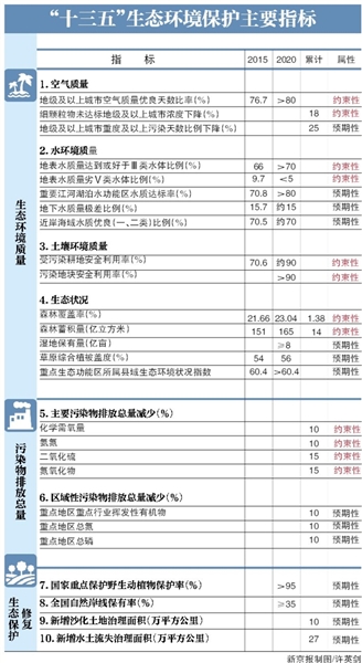 “十三五”期间,细颗粒物(PM2.5)未达标地级及以上城市浓度累计下降18%;到2020年,地级及以上城市空气质量优良天数比率达80%以上。12月5日,《“十三五”生态环境?;す婊罚ㄒ韵录虺啤豆婊罚┱椒⒉迹豆婊分刑岢?2项约束性指标。其中涉及环境质量的8项指标,是第一次进入五年规划的约束性指标。