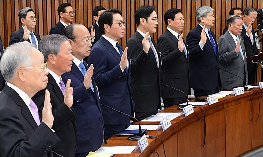 6日举行的“亲信干政门”首轮听证会,韩国9大财阀高层悉数到场。