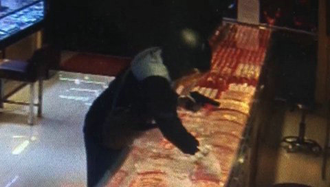 现场监控显示,当日18时31分48秒,一穿黑白上衣、深蓝色牛仔裤的男子走进当地一家名为六六福的珠宝店,其头戴黑色头盔,腰背棕色挎包。男子左手持枪状物,进店起即不断“瞄准”店员,店员受惊吓逃离柜台后,该男子开始用右手中的斧头猛砸柜台玻璃,全过程中共挥斧14次,破开玻璃后用手探入柜台,不断将抓取到的金饰塞进挎包,得手后匆忙逃离现场。