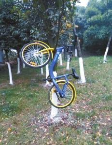 共享单车被挂在树上。(单车公司供图)