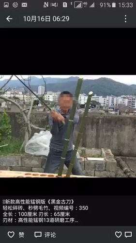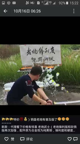 在卖家的朋友圈里,还附有许多试用的小视频——只见试用者持枪瞄准,大约十米开外的啤酒瓶应声破碎,啤酒撒了一地。记者细细翻起每一段视频,让人不禁冒出一身冷汗。在一段视频中,一名男子双手举着一把太刀,面前一张长凳上摆着一排矿泉水,后面立着一个牌子,上面写着“锋利度视频测试”几个大字。只见这名男子放低身形,双手持刀,从左至右一个横削,十几瓶矿泉水齐刷刷被砍成两半??杉庵痔恫⒎巧痰曛谐鍪鄣墓ひ掌罚绱说姆胬?,简直堪称凶器。