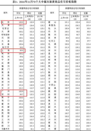 中新网12月19日电 今日,来自国家统计局网站的数据显示,2016年11月份,70个大中城市中,一线城市房环比基本持平,其中北京新建商品住宅价格指数与上月持平,上海、深圳新建商品住宅价格指数小幅回落0.1%、0.3%,广州环比上涨0.9%。