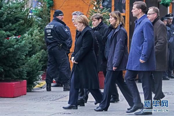 12月20日,在德国首都柏林,德国总理默克尔(中)抵达事发的圣诞集市悼念遇难者。当日,柏林多地举行活动悼念圣诞集市袭击案遇难者。柏林19日发生货车冲入圣诞集市的恐怖袭击事件,造成至少12人死亡、49人受伤。新华社记者王勍摄