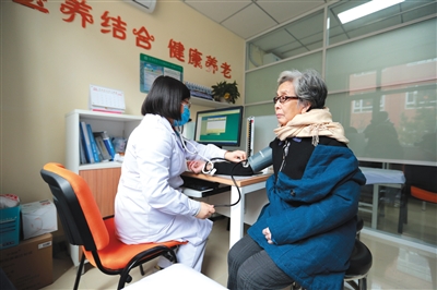 12月13日,东坝“医养结合”服务中心,工作人员在为老人测量血压。朝阳区政府 供图