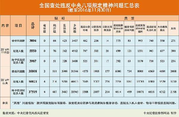 据中央纪委监察部网站消息消息,2016年以来,截至11月30日,全国查处违反中央八项规定精神问题35808起,处理50821人(含4名省部级),给予党纪政纪处理人数37519人(含4名省部级)。