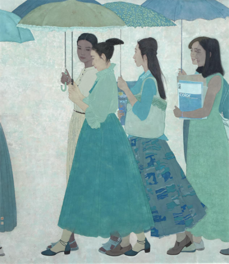 王一婷介绍,这幅作品的主题其实是她近两年心境的写照,少年时期常常思考生死成败这些问题,百思不得其解。现在反而释然了,凡事尽力去做,坦然接受结果,重要的是体验这个过程。"身体或灵魂,一定要有一个在路上","在路上",便成了她很喜欢的一种状态,并以此为题,创作了这幅工笔重彩人物作品。色调的选择上,她用了自己钟爱的群绿色,清新纯净、温润含蓄,平静中蕴含着无限的希望和生机,没有太多的色彩关系,单纯和谐。构图也简化为几个大块,除了女孩外画面一无它物,背景的银箔在矿物色底下闪露微芒,营造出一种朴素典雅的气质,也符合这幅作品的主题:下着雨,女孩们抱着书打着伞迎风前行,从容而自信。