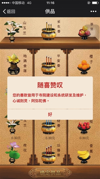 虚拟“佛堂”中售卖鲜花、香烛等供品,价格从0.1元到10元不等。付款后,公号宣称善款将用于“寺院建设和系统研发及维护”。