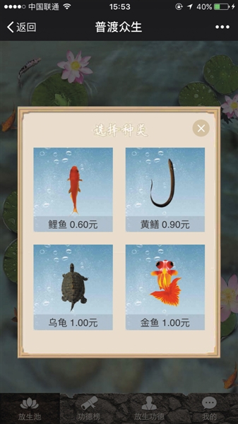 公号的放生功能里,放生的动物种类不同,各自对应有不同的收费标准。图/微信公众号截图